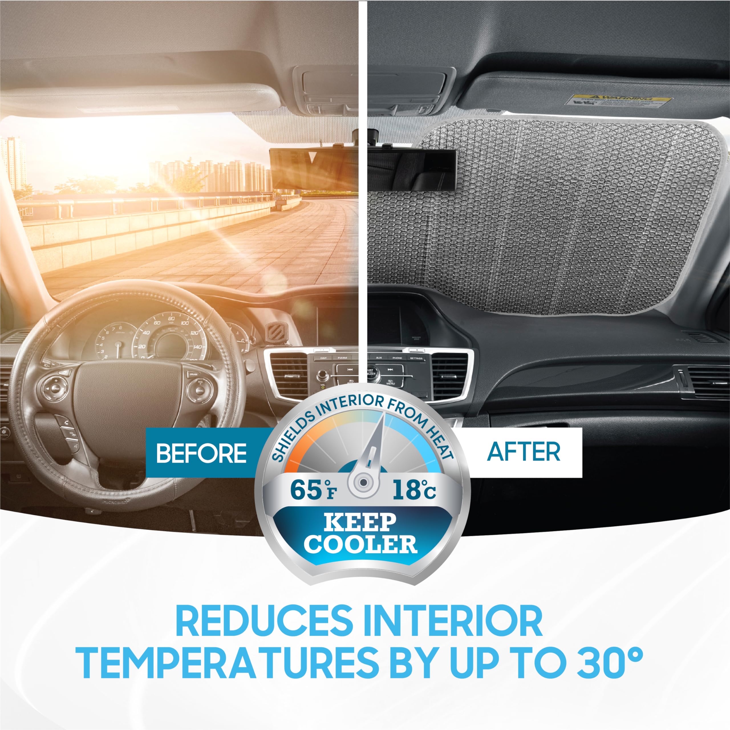 - COMFORTABLE COOL INTERIOR: On a typical sunny day, avoid the extra heat with our car sun shade and keep your interior cool with our top quality windshield sunshade protector. Reduces interior car & truck temperatures by 30-50 degrees by blocking damaging UV rays. The sun shade for car will keep your windows & interior cooler on sunny days allowing you to have a far more comfortable drive for everyone.